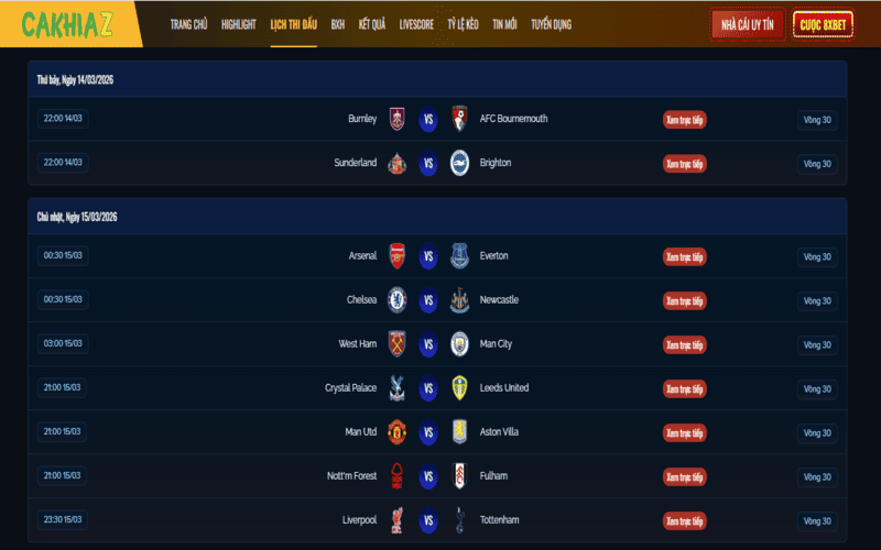 Cakhia TV cung cấp KQBD đồng bộ và BXH theo thời gian thực