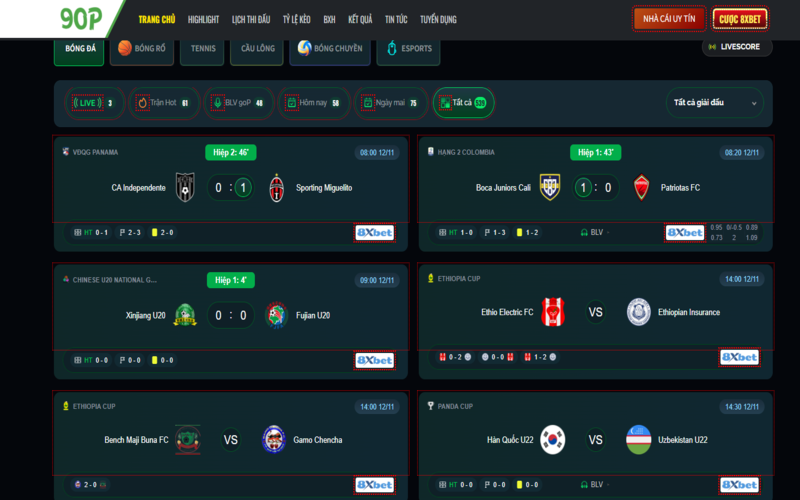 - Sau khi truy cập, tại giao diện chính, các trận đấu đang diễn ra, sắp tới và các giải đấu nổi bật như Premier League, La Liga, Champions League đều được hiển thị rõ ràng.